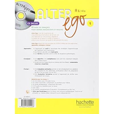 Structure : → 9 dossiers :1 : Les uns, les autres2: Ici, ailleurs3 : Dis-moi qui tu es4 : Une journée particulière5 : Vie privée, vie publique6 : Voyages, voyages7 : C'est mon choix8 : Pour le plaisir9 : Lieux de vie→ Un dossier final : Horizons, une ouverture sur le niveau suivant→ À la fin du manuel :- la transcription des dialogues- un précis grammatical- un lexique multilingue→ Chaque dossier comprend 3 leçons de 4 pages chacune, deux pages de carnet de voyage (parcours à dominante culturelle et interactive), et se conclut par une fiche de réflexion / autoévaluation.→ Différents modules thématiques viennent articuler les leçons :- les Points langues, pour conceptualiser la formulation des actes de parole,- la grammaire et le lexique adoptant une démarche inductive- l'Aide mémoire, pour reprendre l'essentiel- le Point culture- la phonétique→ L'évaluation partagée (formative et sommative) permet de faire le point sur l'ensemble des acquis.→ Enfin, le portfolio permet un suivi synthétique des progrès accomplis, et 4 bilans offrent une véritable préparation aux différentes certifications (DELF A1, CEFP 1, TCF, TEF) et préparent au niveau A2.→ Existe aussi en version numérique.Descriptif :Méthode pour grands adolescents et adultes, Alter Ego est fondée sur les recommandations du Cadre Européen commun de Référence. Elle favorise ainsi une approche actionnelle, une évaluation partagée et le développement de l'autonomie.L'apprenant est amené à acquérir de véritables compétences de communication, réaliser des tâches authentiques, interagir dans des situations diversifiées, grâce à une méthode prête à l'emploi et aux thématiques variées.