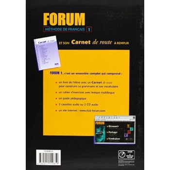 Nouveauté! Les pages Point Delf de Forum 1 ont été renouvelées dans le livre de l'élève.Vous pouvez télécharger ces pages au format *.pdf (menu de droite, rubrique "Téléchargez des extraits")La méthode Forum :> met en application de façon active les recommandations du "cadre européen de référence".> développe savoir, savoir-faire, savoir-être et savoir-apprendre.> intègre de façon innovante les avancées de la recherche en didactique du FLE : communication globale, dimension affective de l'apprentissage, autonomie, interculturel.> propose de nombreux outils d'évaluation.> permet une progression grammaticale structurée et solide.> prépare au Nouveau DELF 1er degré, . Structure du livre de l'élève :L'ouvrage s'organise en trois modules, de trois unités chacun, correspondant à trois univers de communication .Au début de l'ouvrage, une unité en présente le fonctionnement.En fin d'ouvrage, sont présentées les annexes suivantes :- un Portfolio, permettant à l'étudiant d'évaluer ses connaissances- les transcriptions des enregistrements- un Mémento grammatical- des Tableaux de conjugaison.Chaque unité comprend : 1 page d'ouverture : le contrat d'apprentissage.13 pages centrales d'apprentissage de la langue :- Forum (2 p.) : mise en train à partir d'une grande photo situationnelle ; - Agir-Réagir (4 p.) : phase de compréhension globale ; - Connaître et Reconnaître (3 p.) : construction de la grammaire, relayée par le Carnet de route ; - S'exprimer (4 p.) : réinvestissement des acquis. 4 pages "Pour aller plus loin" :- Pause-jeux : 1 p. de bilan ludique- Interculturel : dossier de 2 p. pour découvrir le Cadre de vie des Français et leurs Comportements ;- Point-Delf (Nouveau DELF).